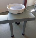 Specielt afsætning og rækkevide til vand og redskaber adskiller den fra andre populære drejeskiver. Du skal ikke række "hen over og ned" bag skiven for adgang til vand og værktøj .