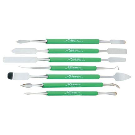 - Sættet består af syv dobbeltsidede redskaber til modellering af ler.